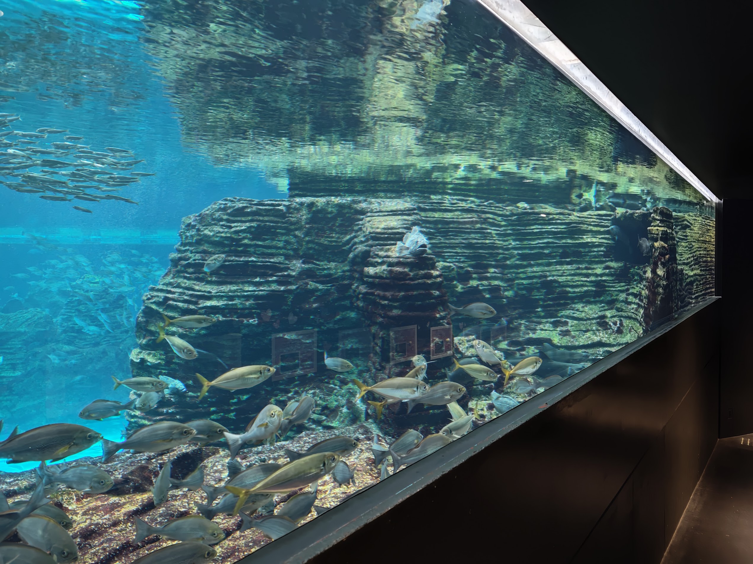 这个水族馆的特色是直面大海的大水槽,天气好的时候是这样的: