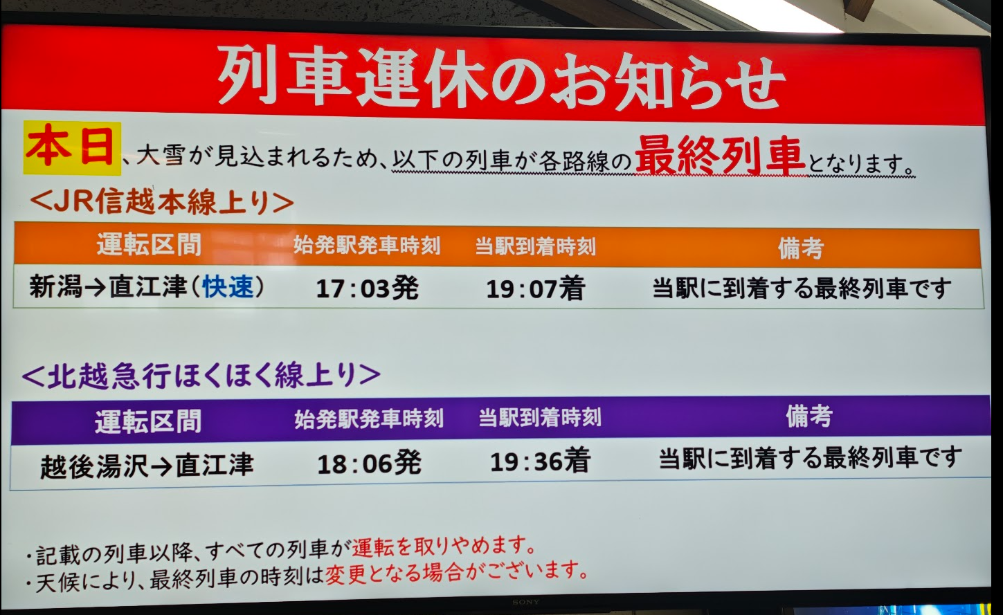 出发前两周,日本海侧下了几场上新闻的大雪,我才发现一个问题:雪是大了,但是交通是难办了,在来线一旦遇到大雪天气就是停运的命。